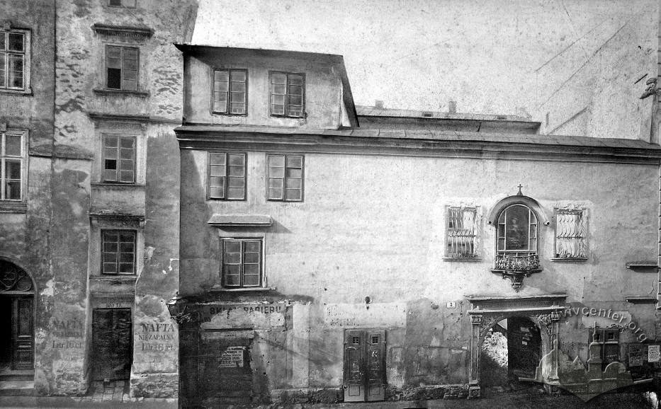 The building at 3 Drukarska Street was built c. 1543, and was owned by Stanislaw Schtansl Scholtz. The building later become known as “Under the Mother of God” because of a statue of the Virgin Mary on the façade. In 1858 the building housed the St. Sophia Association of the Blind. Goods that arrived to Lviv were kept in stored in the courtyard of the building. At the end of the nineteenth century the building was demolished because it had fallen in disrepair. Interestingly, the picture of the original building shows nineteenth-century ghost signs. Judging from the signs, there was a warehouse for paper (sklad papieru) and in the building to the right paraffin (kerosene) oil (nafta niezapalna) was sold.