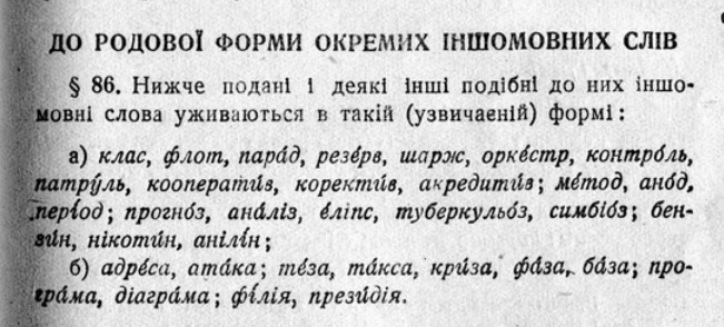 | Жіночий рід для деяких запозичень (напр., метода) | Рід змінено на чоловічий (напр., метод) | Застосовується правило 1933 р. |