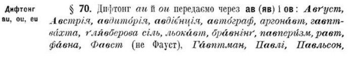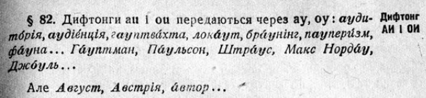 | Використання ав для дифтонга au (напр., авдиторія) | Звук змінено на ау (напр., аудиторія) | Прийняті обидва варіянти ау/ав (аудиторія/авдиторія) |