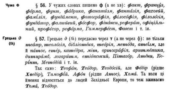 | Використання т для грецької θ (напр., маратон) | Змінено на ф (напр., марафон) | Прийняті обидва варіянти |